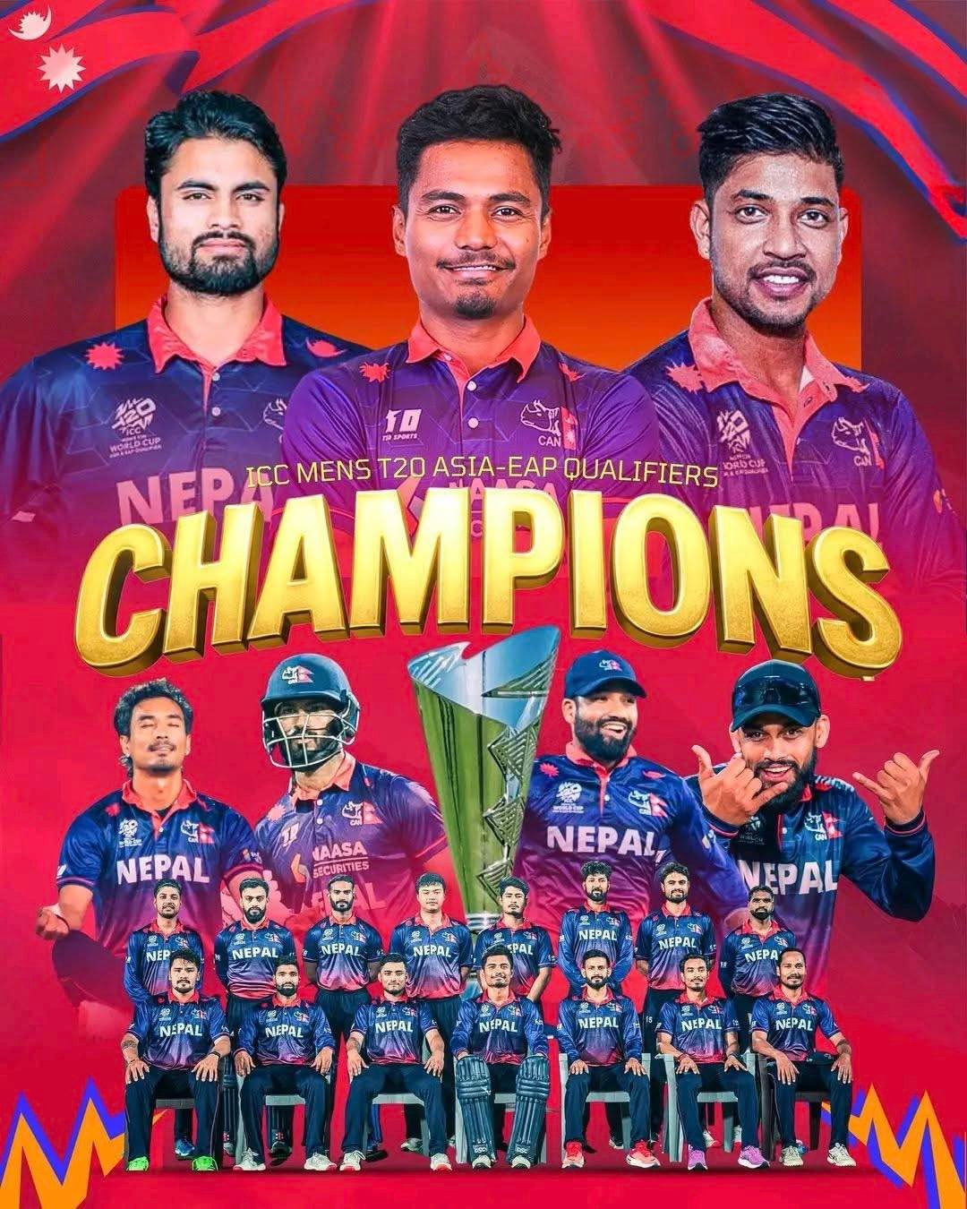 नेपालले आईसीसी टी-२० विश्वकप एसिया तथा इस्ट एसिया पेसिफिक छनोटको उपाधि जितेको छ ।