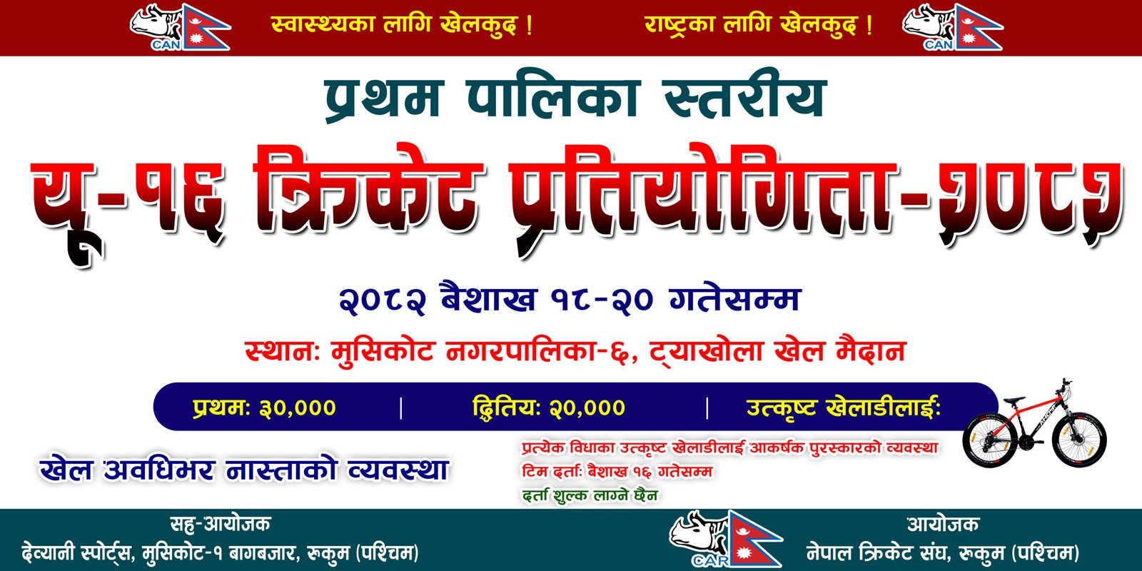 रुकुम पश्चिमा प्रथम पालिका स्तरीय यू- १६ क्रिकेट प्रतियोगिता हुने भएको छ ।